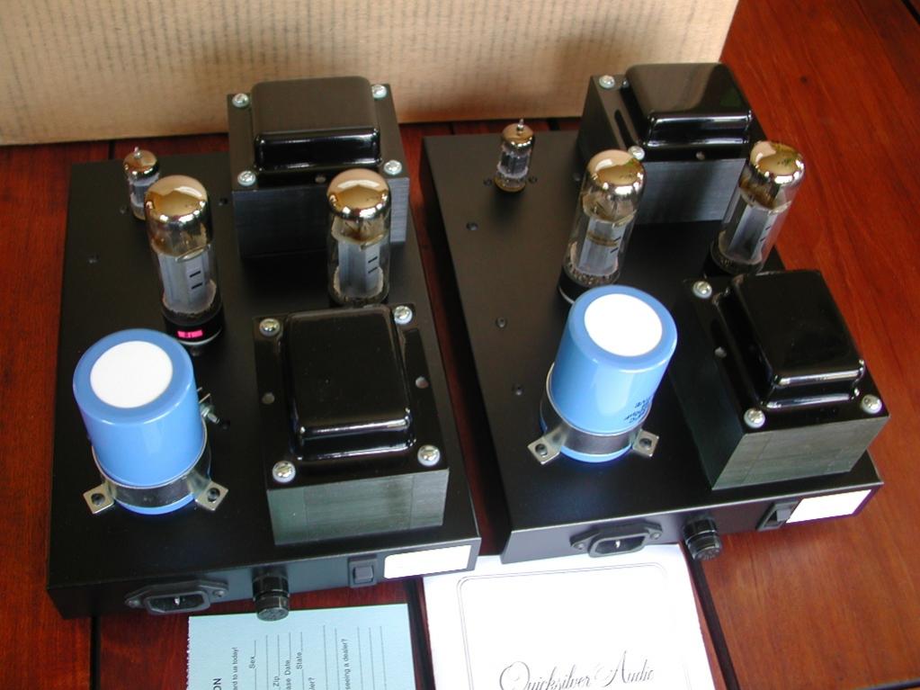 Quicksilver mini mono tube amps. Made in USA 25wpc 12AX7/EL34 tubes, auto bias. Great shape, no issues, approx 75 hours or so on the amps. Stock tubes installed. Great little amps, I am hip-deep into DIY tube amps so my amp collection runneth over.