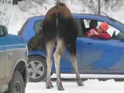 Looks like this video was taken at the Canadian Moose Training Grounds, with the moose being taught that cars are a good source of sodium. Once training is completed, they're hustled across the border (at night, of course) where they sew havoc and mayhem upon the vehicles of honest, law-abiding Americans ! How many moose lickety-licks, lickety-licks does it take before the finish is ruined on a car ?