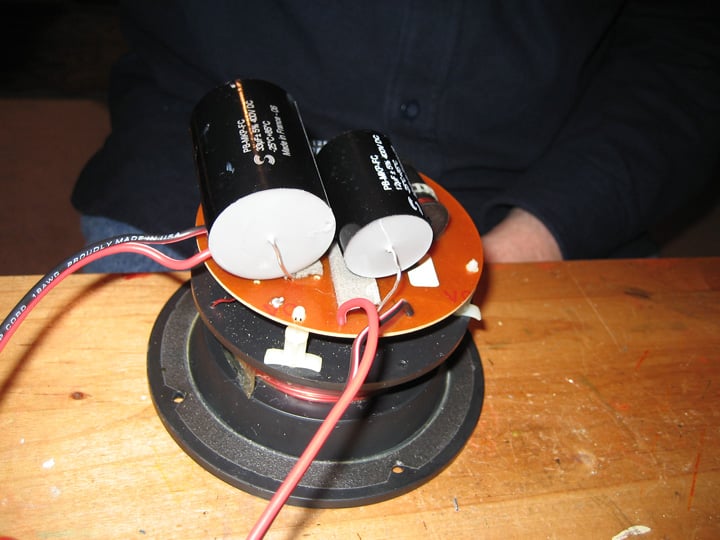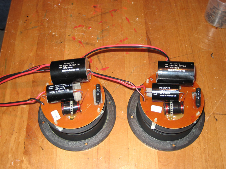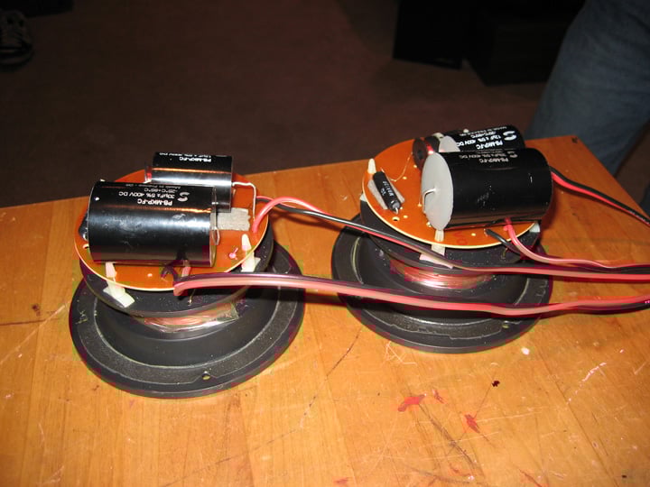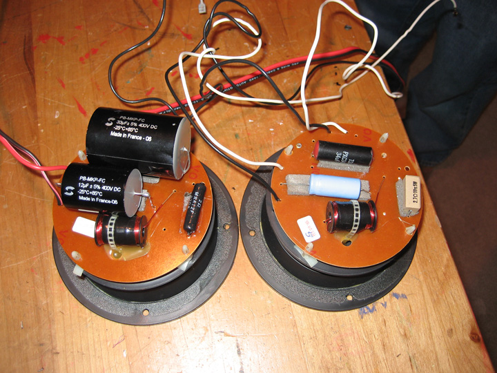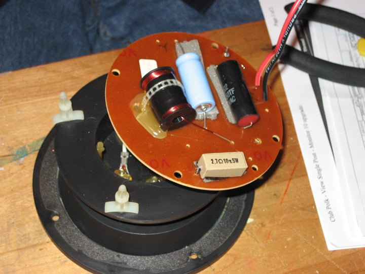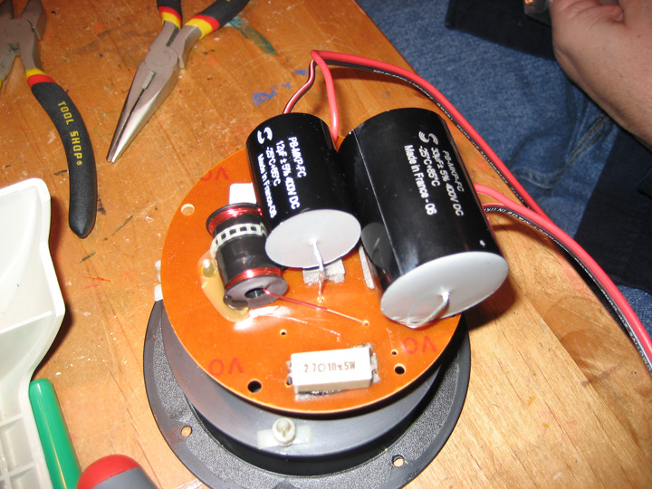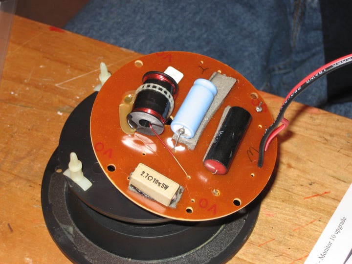 I decided to start a new thread in the appropriate forum as a reference for those who want to see how it's done. This upgrade was very simple if only a bit time consuming. No special tools needed and anyone with a steady hand and basic soldering knowledge can do this. There is a minimum of dis-assembly required. I do however recommend pulling the drivers and the passive radiator, especially if you want to upgrade the internal wiring. It also gives you a chance to visually inspect the drivers for damage and/or correct parts. However there is enough length of wire to pull just the x-over out for upgrading.