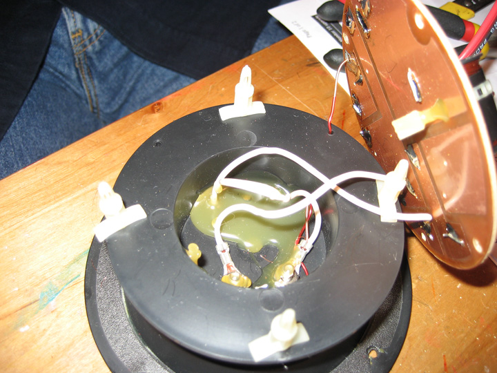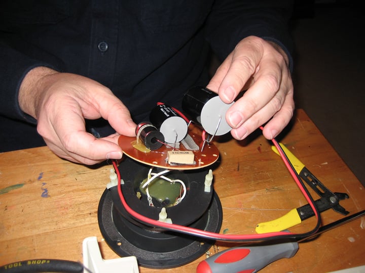I also recommend doing one x-over at a time so if you get confused or forget where something goes you have an unmolested one for reference. Polk used Black and Green for positive (+) and white for negative (-). I also wrote the polarity on the back of each tweet so as not to get confused upon reinstallation.