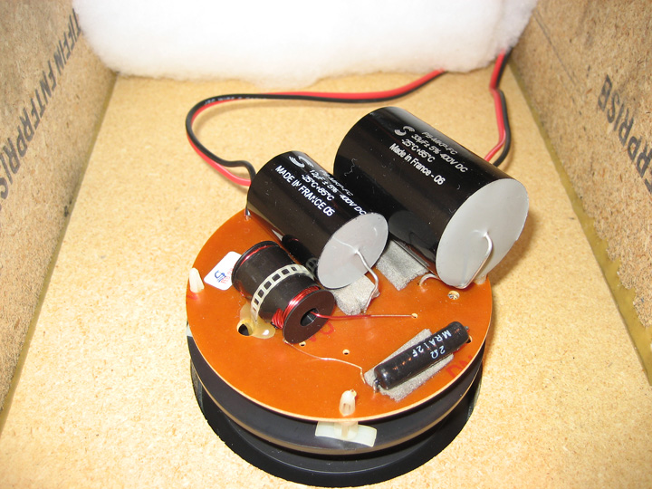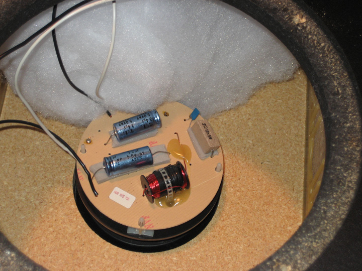 14) a shot thru the passive radiator cut-out of the upgraded x-over re-installed in the cabinet.