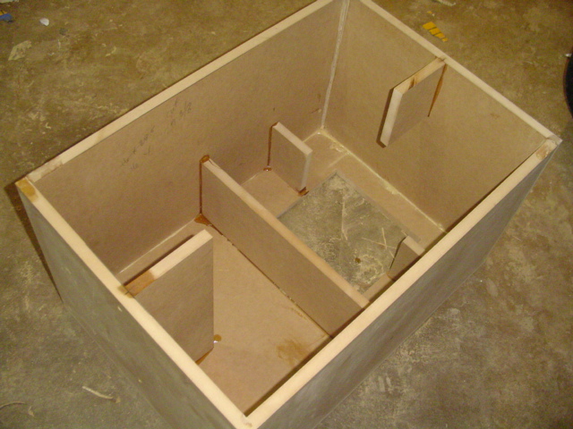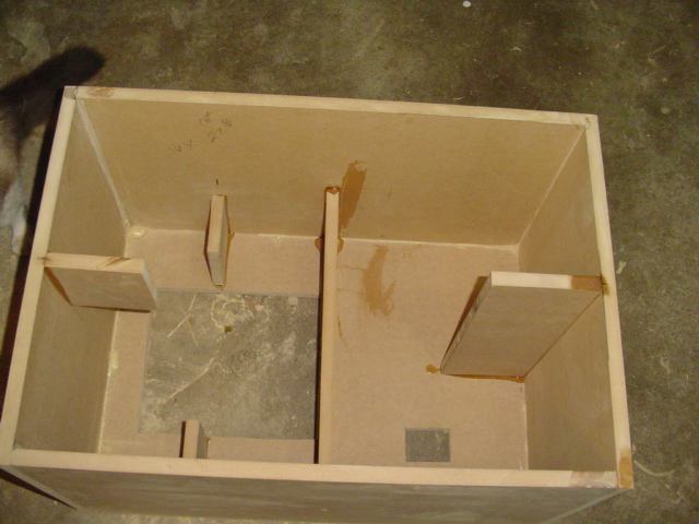 The bracing explaination On the one side you see is just a short piece I wanted to connect front and back plates with the top and bottom , In the center that worked well, on the right side it worked well. on the other where the amp is I had the amp in the way and that is just what I came up with. Im still thinking of using two oak 1 inch rods Like I normally do just to the right and left of the speaker. This should firm it up a bit, THe small pieces by the amp shore up that area because in my opinion the 3 /16ths amplate needs help . I ve doubled the front baffle the bottom plate the only piece that vibrates a little is the top. Its enough to walk a remote off of it ( I wanted 1 inch mdf didnt want to wait for it to come in) To cover it again is about the same amount of work if I use rods.....So Im up in the air.