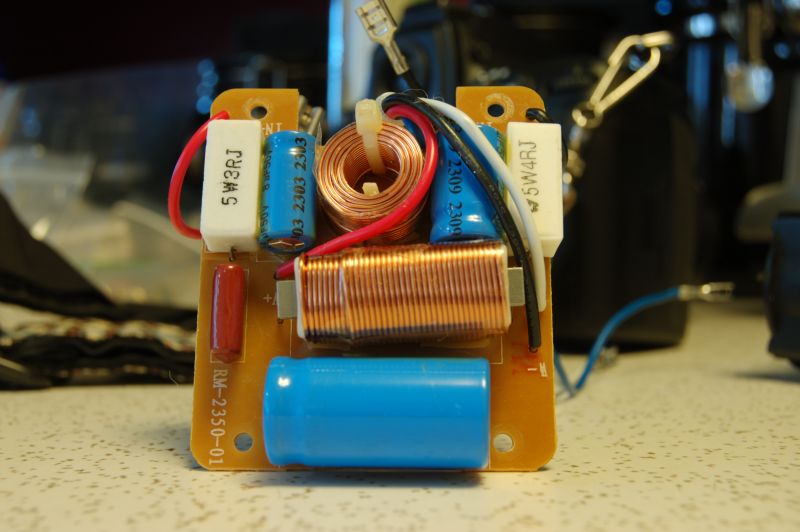 After reattaching the woofer, I took a look at the x-over. It appears all electrolytics are used with the exception of a .1uf bypass cap on the HF section. The LF section also has a 330uf filter cap to protect the small woofer from low frequencies. I took out my bin of spare parts to see what I could replace to help it's SQ. I replaced the 8.0uf and .1uf caps in the HF section with a pair of Solens that added up to 8.3uf(close enough). I put everything back together and gave it a quick listen. The highs improved a little, but the rest of the speaker was still in dire help. It still had a hollow sound to it and the mids were really congested.