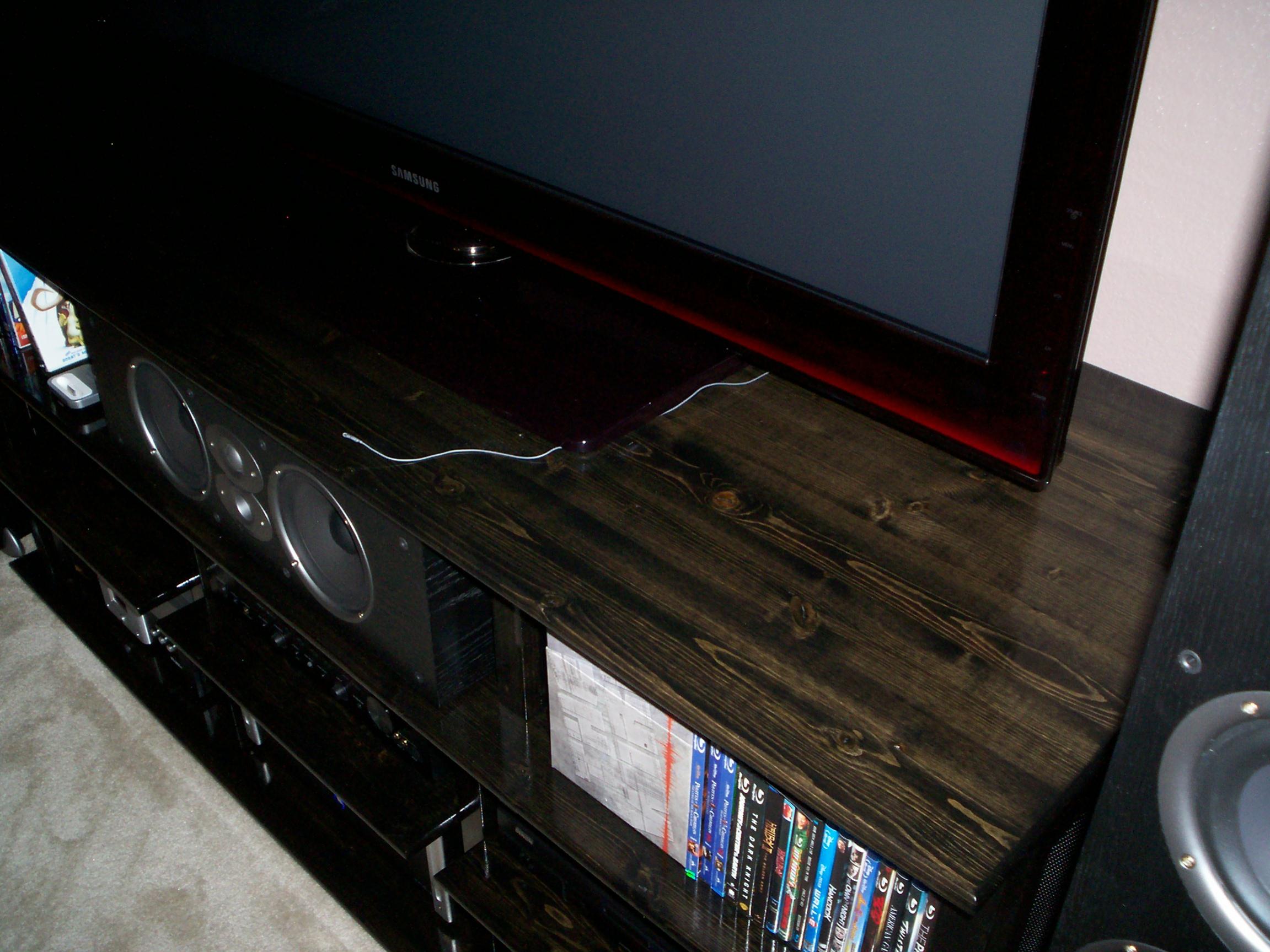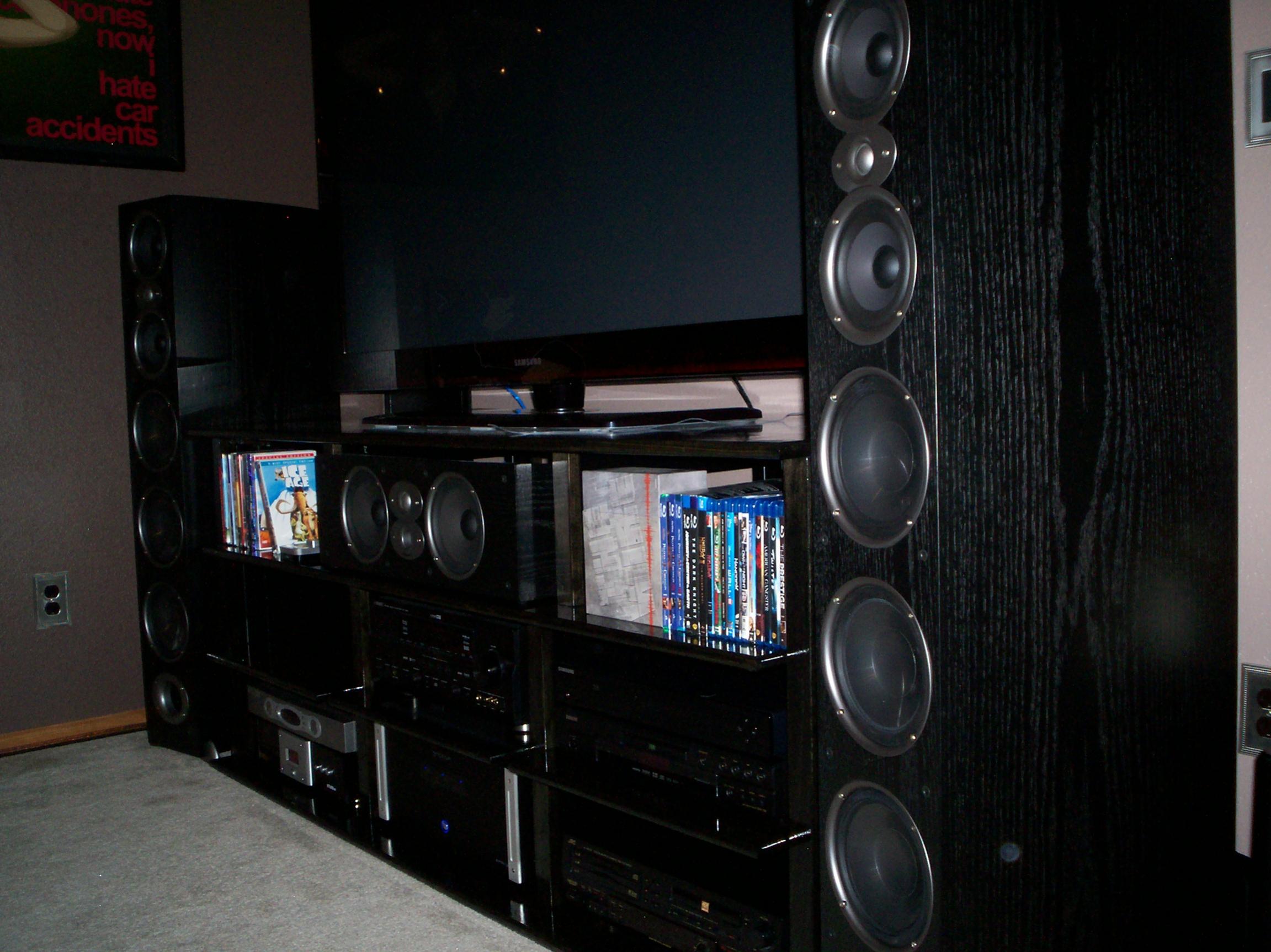 Finished my TV/Stereo stand. so far im digging what i have done in the last month. I ordered my Harmony One. today i will order some speakerwire from blue jeans website 12 awg im debating if i want the banana plugs on one end or just run it bare.