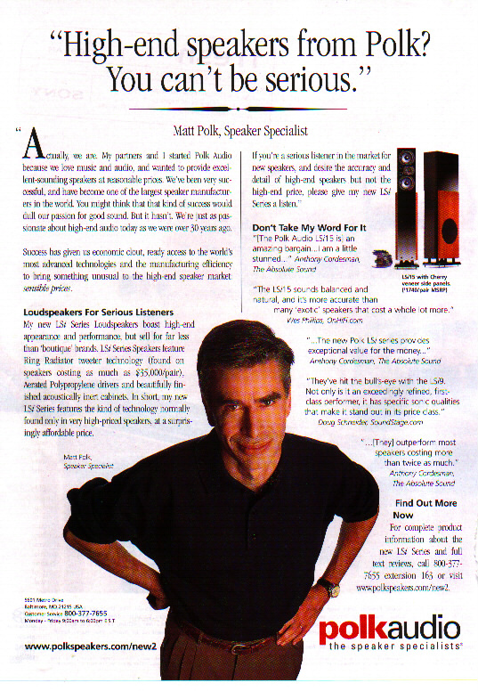 Could it be a better ad? You bet it could. It could have a really ingenius headline. (Altho, this particular ad has a pretty provocative headline -- as Mantis noted, "The first thing I think If I didnt know better is that this insinuates that Polk finally produced a high end speaker. (not so) The add degrades POLK!!" All I have to say to that is: MADEJALOOK!) It could have a really expensive and professional beauty shot of our speakers in a glorious location or a high end home. It could have real impressive third-party testimonials about the speaker, from audio reviewers you know and trust. It could reinforce the brand with a bigger logo, reinforce the good will of knowing that a real human guy is behind our company and our technology... Hmmm. It's doing most of those things. Could it be better? Yep. If we had a Bose-sized media buying budget, you'd see Polk ads everywhere; good ones, too. Different.